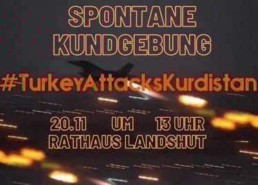 Am 20. November fand vor dem Rathaus Landshut eine spontane Kundgebung statt, nachdem erneut Angriffe der türkischen Armee auf Gebiete in Kurdistan gemeldet wurden. Unter dem Hashtag #TurkeyAttacksKurdistan versammelten sich zahlreiche Menschen, um ihre Solidarität auszudrücken und auf die aktuelle Lage aufmerksam zu machen. Vielen Dank an alle, die trotz der kurzfristigen Ankündigung gekommen sind und ein sichtbares Zeichen gesetzt haben.