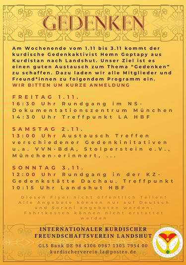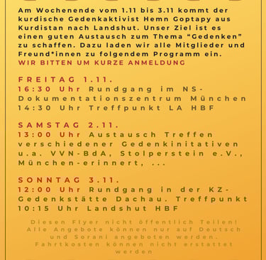 Das Gedenkwochenende vom 1. bis 3. November mit dem kurdischen Gedenkaktivisten Hemn Goptapy bot vielfältige Einblicke und Austauschmöglichkeiten rund um das Thema Erinnerungskultur. Das Programm umfasste einen Rundgang im NS-Dokumentationszentrum in München, ein Treffen mit verschiedenen Gedenkinitiativen sowie einen Besuch der KZ-Gedenkstätte Dachau.