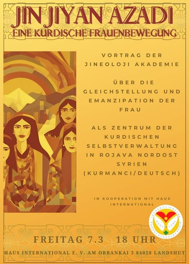 Der Vortrag „Jin Jiyan Azadî – Eine kurdische Frauenbewegung“ am 7. März stieß auf großes Interesse. Die Referentinnen der Jineoloji-Akademie gaben einen umfassenden Einblick in die Rolle der Frauen in der kurdischen Selbstverwaltung in Rojava und sprachen über Gleichstellung und Emanzipation. Wir danken allen Besucher:innen sowie dem Haus International für die Zusammenarbeit.