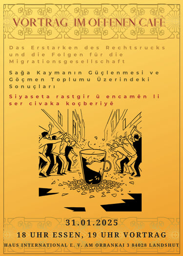 Der Vortrag am 31. Januar im Offenen Café behandelte das Erstarken des Rechtsrucks und dessen Auswirkungen auf die Migrationsgesellschaft. Die Präsentation bot einen klaren Überblick über aktuelle Entwicklungen sowie deren Bedeutung für migrantische Communities. Das gemeinsame Essen vorab schuf einen angenehmen Rahmen für erste Gespräche. Vielen Dank an alle, die teilgenommen und den Abend mitgestaltet haben