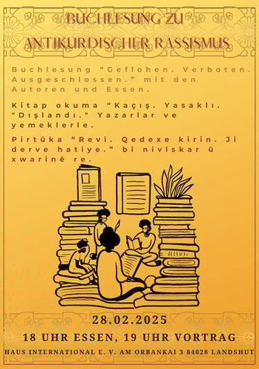 Die Buchlesung „Geflohen. Verboten. Ausgeschlossen.“ am 28. Februar im Haus International war gut besucht und bot einen klaren Einblick in die Erfahrungen antikurdischen Rassismus. Die Autor:innen stellten zentrale Passagen ihres Buches vor und beantworteten Fragen aus dem Publikum. Das gemeinsame Essen vor der Lesung sorgte für einen angenehmen Einstieg und bot Raum für Austausch. Vielen Dank an alle, die teilgenommen und die Veranstaltung unterstützt haben